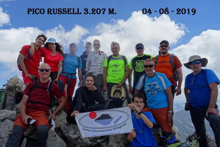 Parte del grupo de excursionistas del Centro Excursionista de la Ribagorza (CER) en la cima del Pico Russell de 3.207 metros. Los participantes disfrutaron de unas magníficas vistas durante el trayecto y desde la cima. Algunos caminantes bajaron andando hasta la población de Benasque.